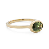 A new perspective on a classic form: The Tess Ring features a striking 1.62 ct oval Australian sapphire set east-west in 14k yellow gold, offering a modern twist on the traditional engagement ring.